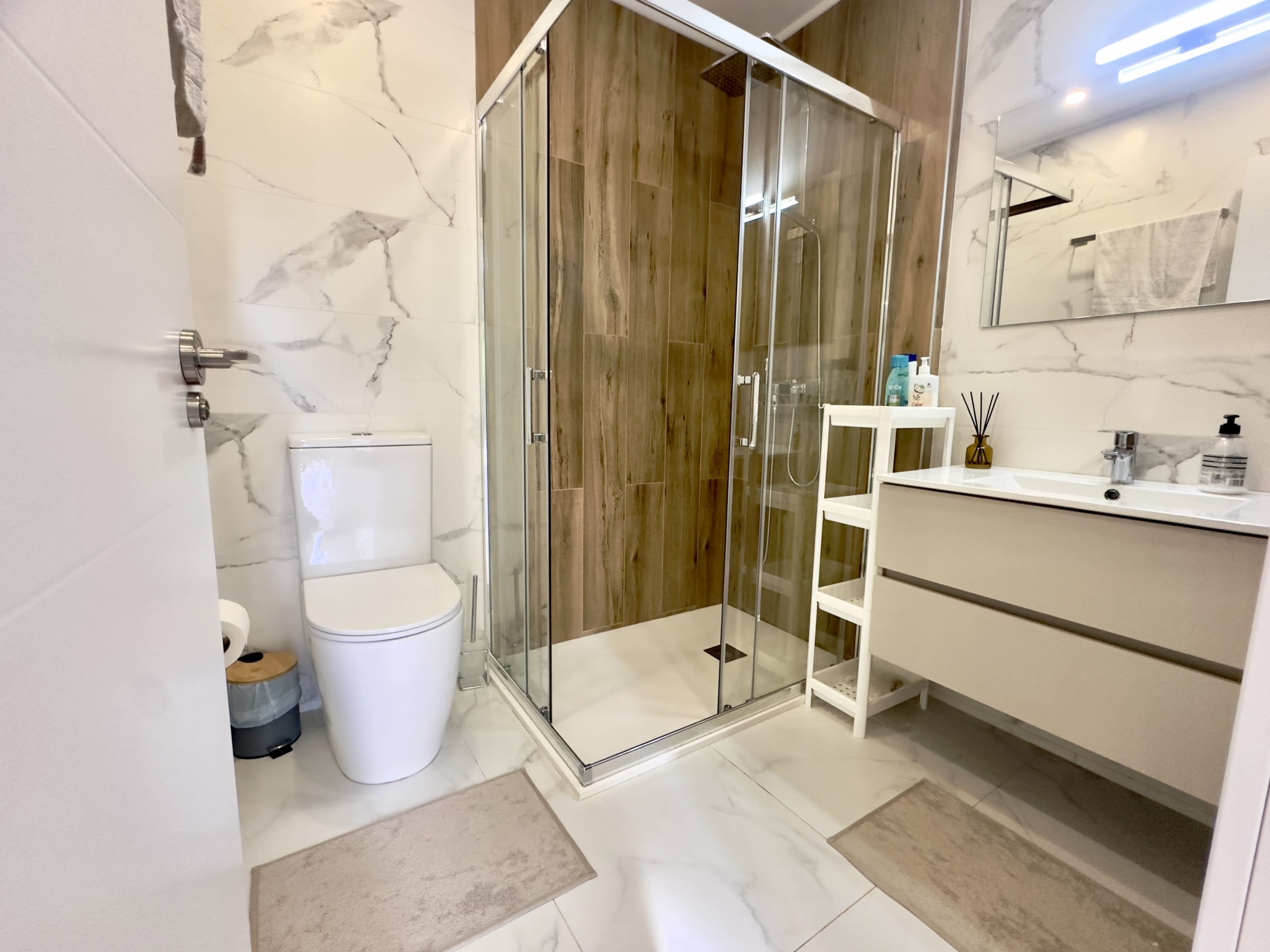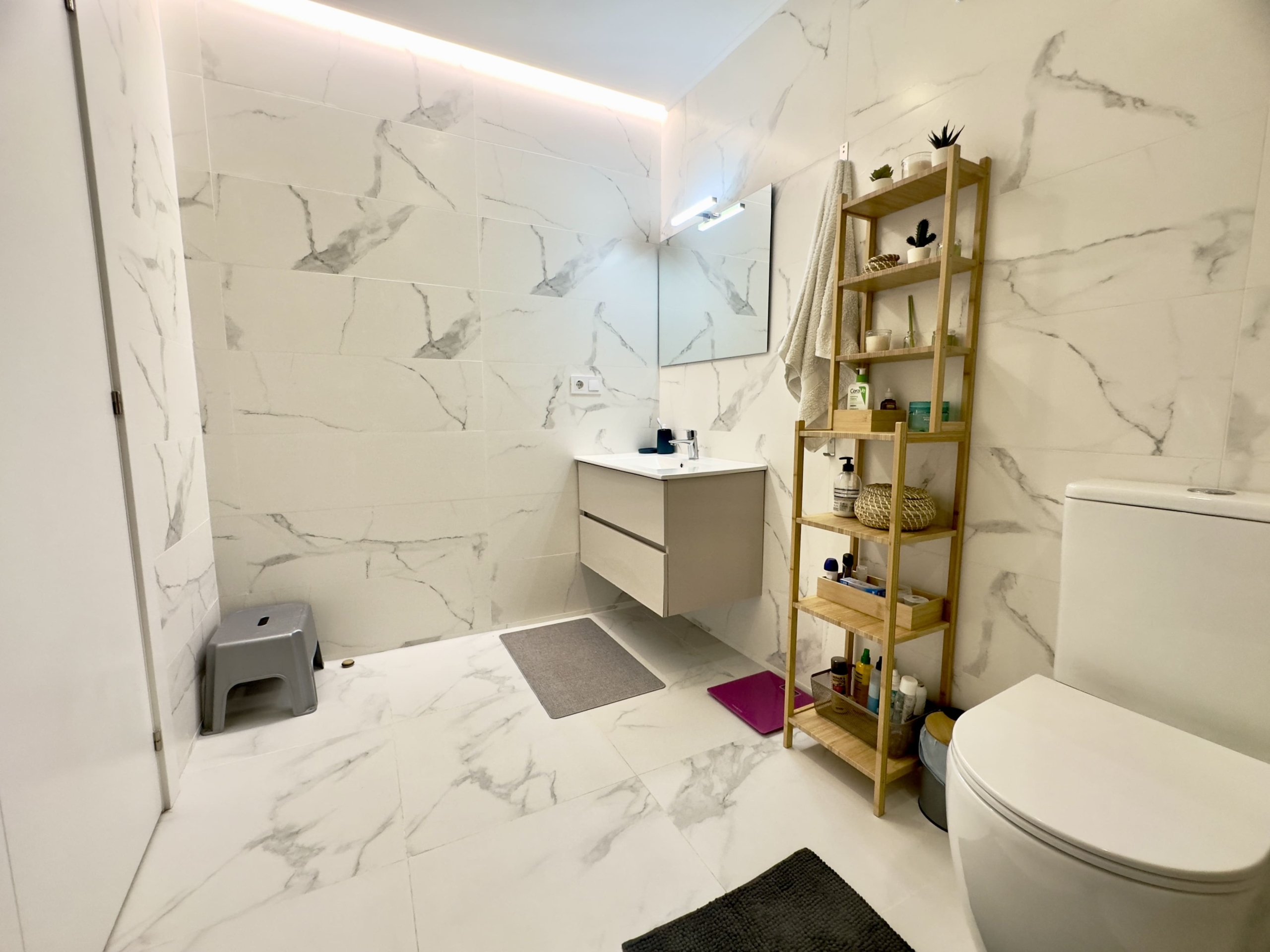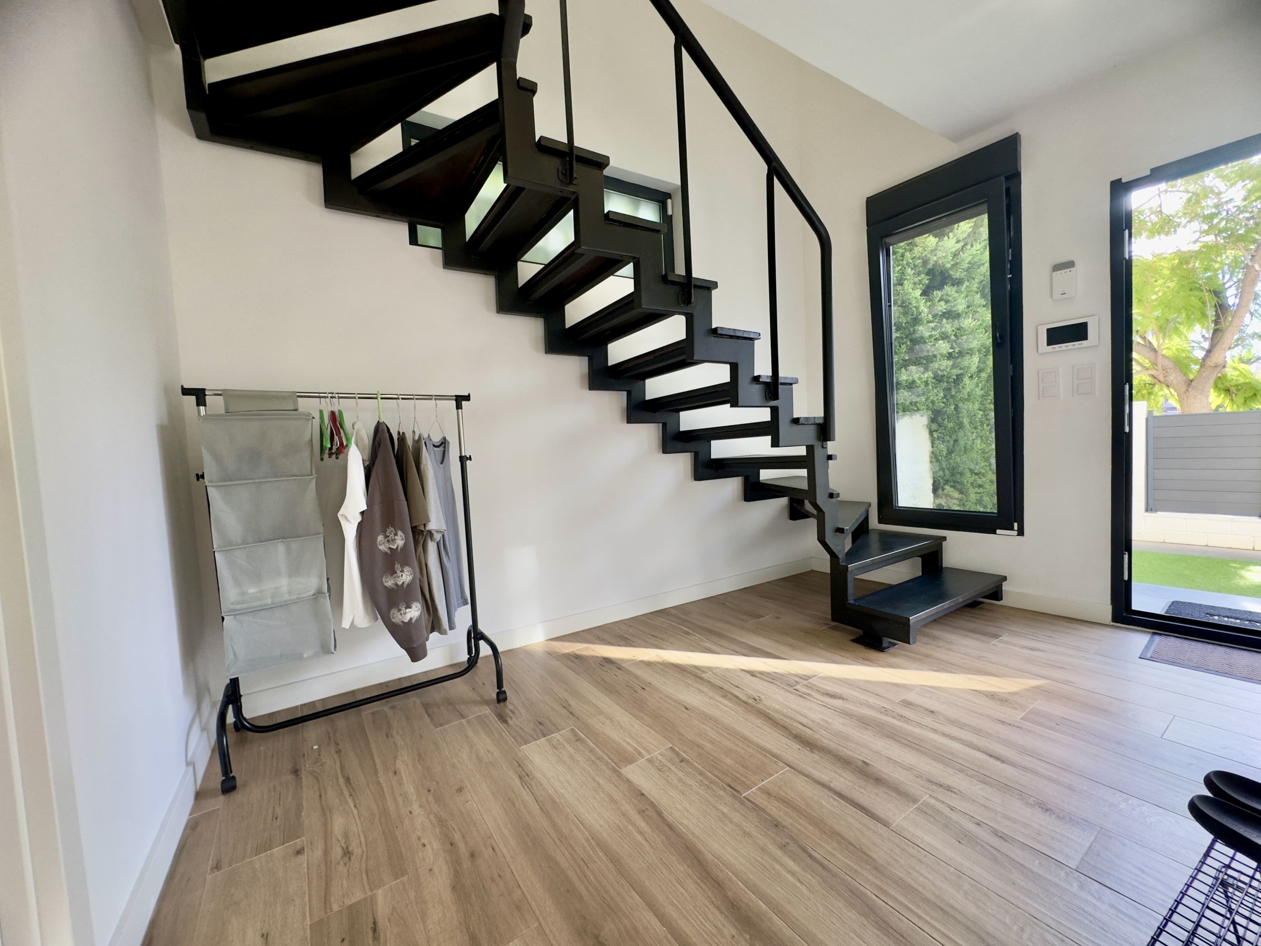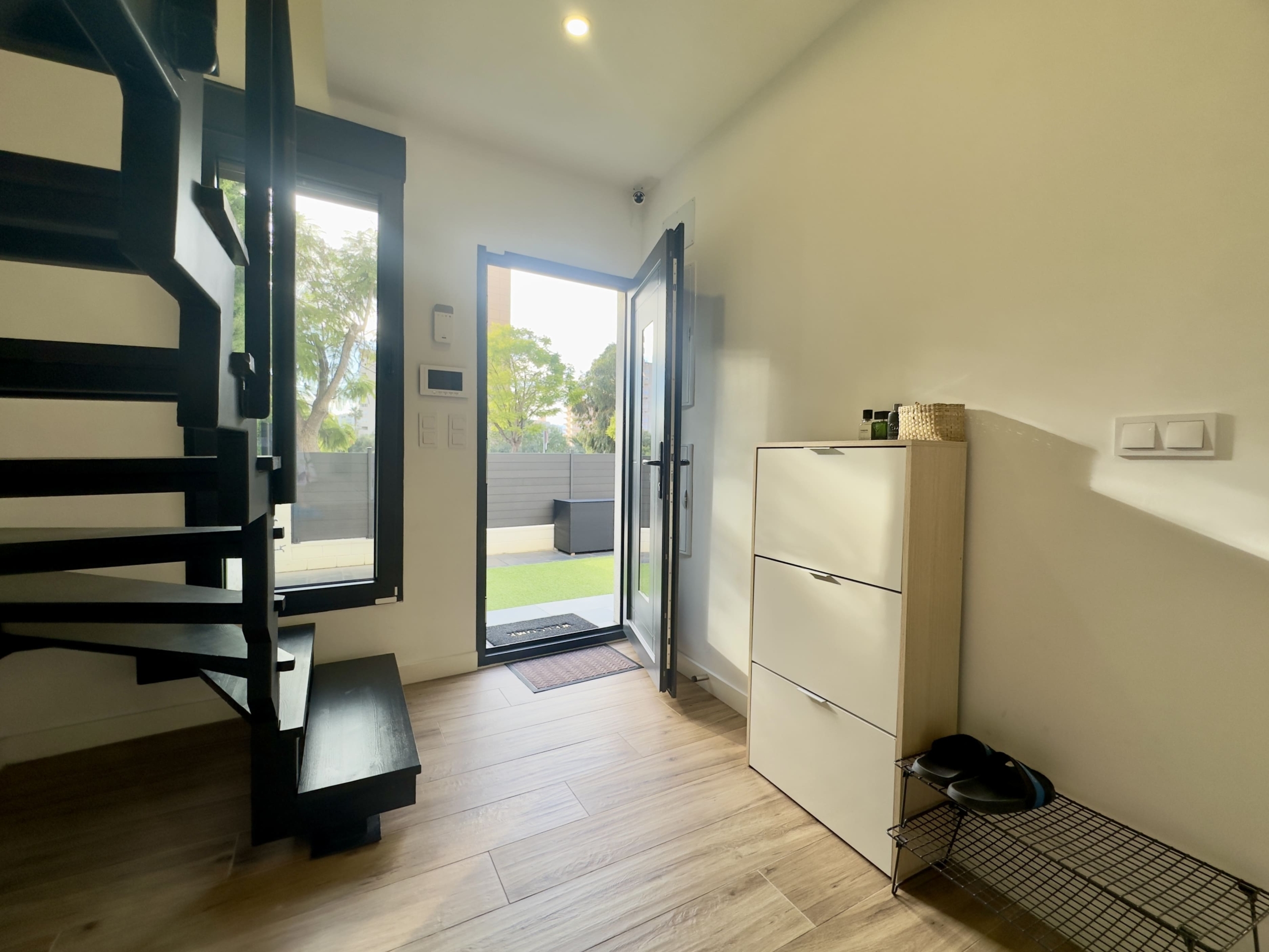 En la planta baja encontrarás un elegante recibidor con zapatero, un baño completo, un luminoso salón-comedor con sofá amplio y televisor de gran formato, y una cocina americana de estilo francés, totalmente equipada con todos los electrodomésticos y utensilios necesarios.