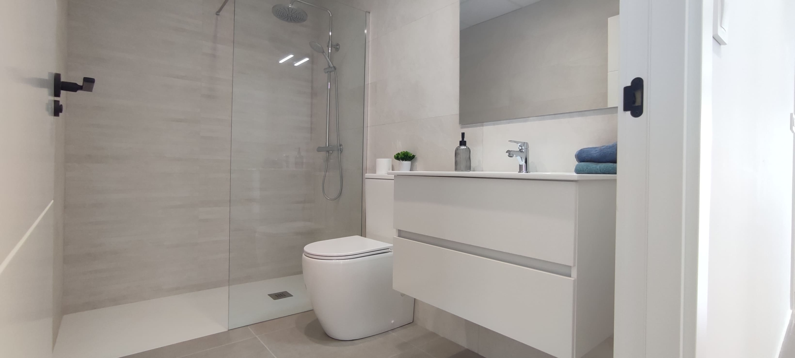 Baños completos con inodoro, tocador, espejo y ducha con mamparas.