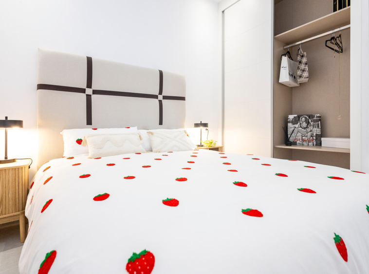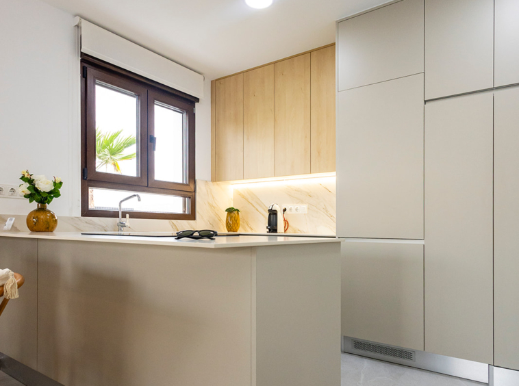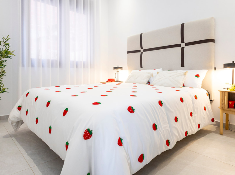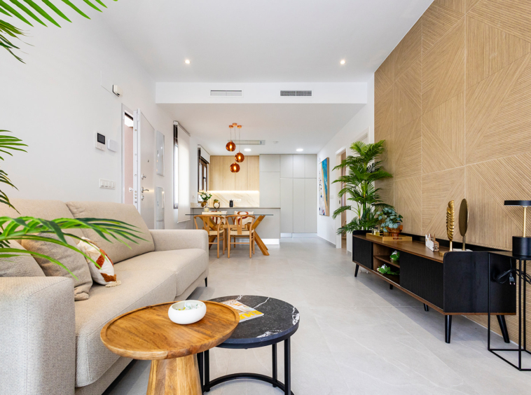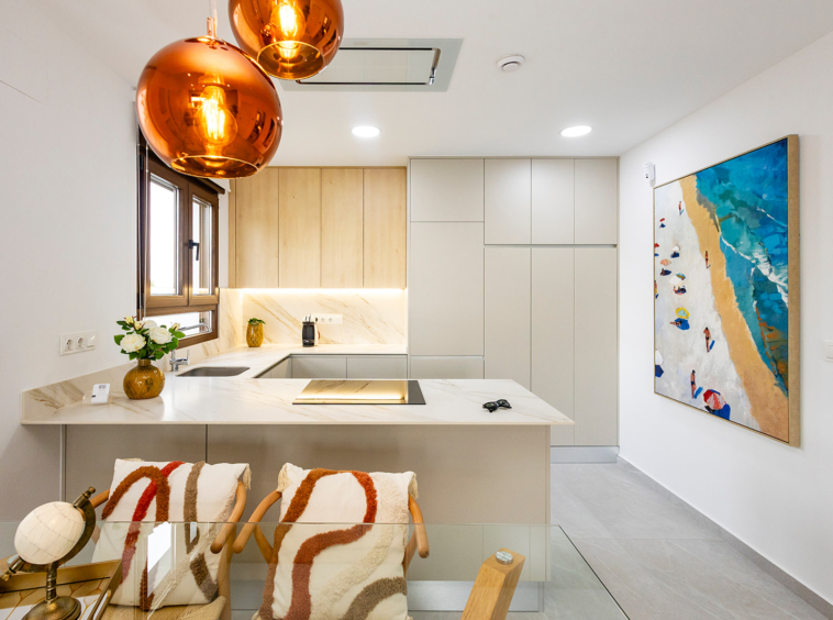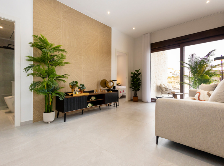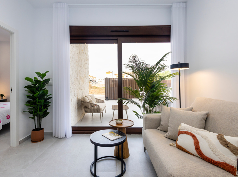 Cada villa cuenta con una terraza con porche cubierto, un amplio salón-comedor con cocina abierta, dos dormitorios luminosos con armarios empotrados y dos baños completos, uno de ellos en suite. A ello se suma un solárium privado de 60 m². Un espacio perfecto para relajarse, disfrutar del clima mediterráneo y contemplar atardeceres únicos gracias a su orientación oeste.